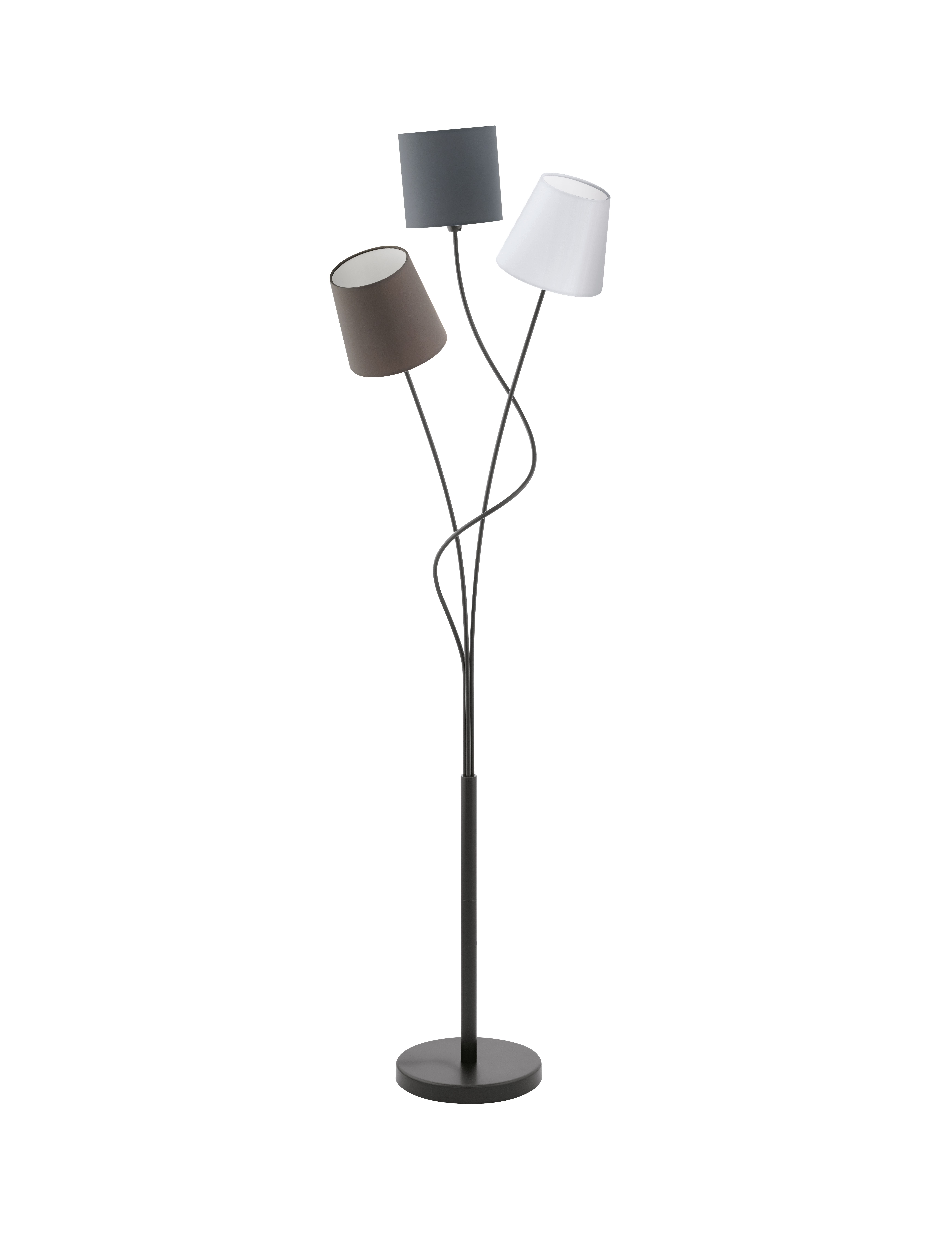 Diese Stehleuchte der Serie MARONDA ist aus schwarzem Stahl sowie Textil in den Farben Anthrazit, Weiß und Braun gefertigt und wird mittels Trittschalter bedient. Sie verfügt über eine Schutzisolierung und benötigt zum Strahlen drei E14-Leuchtmittel. Die Leuchte fasziniert durch die spezielle Anordnung ihrer Textilschirme und wird somit zum Hingucker in Ihren vier Wänden.