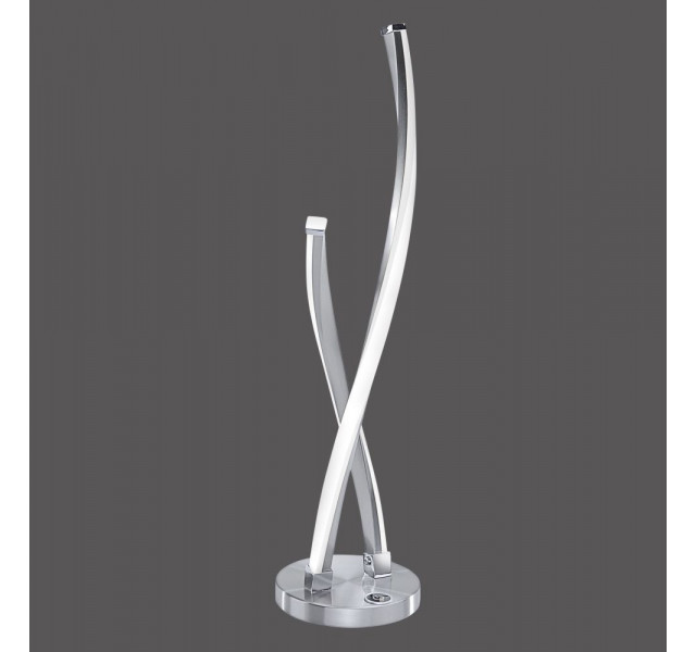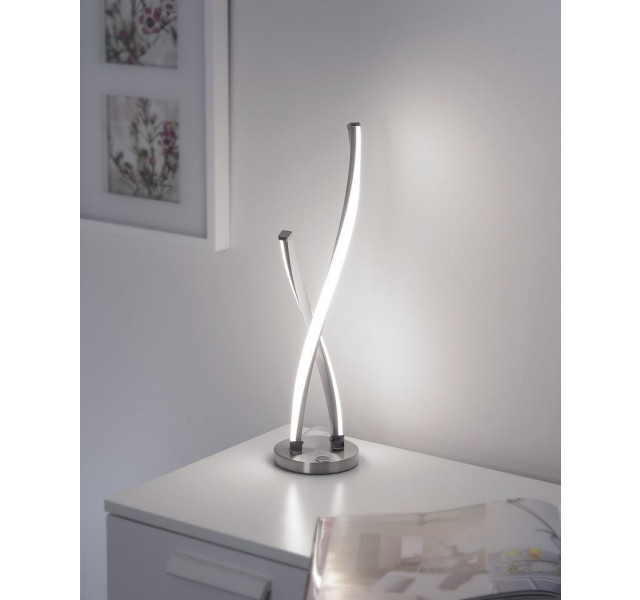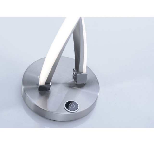 Eine moderne Tischleuchte mit zwei geschwungene Stäben die mit festverbaute LED Leuchtmittel mit geliefert werden. Durch den Touchdimmer können Sie entscheiden wie hell die Leuchte leuchten soll.